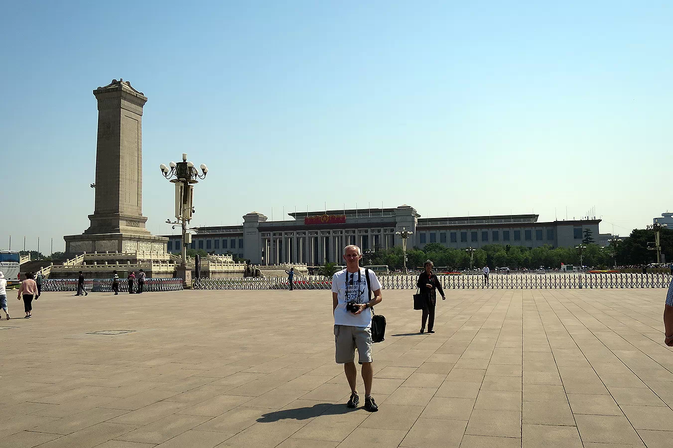 To największy na świecie plac miejski - obecnie ma 40ha, choć jeszcze w latach '60 XXw. było to 11ha. Powiększono go by mógł pomieścić milion zwolenników władzy komunistycznej. Od czasów dynasti Ming na placu, otoczonym wówczas murem, stanowiącym część Wewnętrznego Miasta, zlokalizowane były główne urzędy państwowe: ministerstwa, cesarski szpital i akademia. Przez jego środek przebiegał zadaszony Korytarz Tysiąca Bu (1bu=1,5m), którym mogli chodzić tylko najwyżsi dostojnicy państwowi. Pośrodku placu stoi postawna kolumna - pomnik Bohaterów Ludowych. Dookoła plac otoczony jest majestatycznymi gmachami: Halą Ludową (parlament) i Muzeum Narodowym przy dłuższych bokach oraz Bramą Niebiańskiego Spokoju i Bramą Na Wprost Słońca - przy krótszych. Ta ostatnia była kiedyś południową bramą miejską Pekinu, stanowiącą wejście na teren Wewnętrznego Miasta, zarezerwowanego dla urzędników. Zwykli obywatele mieli tu bardzo ograniczony dostęp. Kiedyś była największą z pekińskich bram, ale została podzielona na dwie części, pomiędzy którymi przebiega szeroka, ruchliwa ulica. Przez Bramę Na Wprost Słońca cesarz udawał się do Świątyni Nieba, którą odwiedziliśmy dwa dni wcześniej. Po przeciwnej stronie placu stoi równie okazała Brama Niebiańskiego Spokoju, za którą położone jest Zakazane Miasto - pałac cesarski, do którego oprócz rodziny cesarskiej wstęp mieli tylko najwyżsi urzędnicy państwowi. Olbrzymia przestrzeń Placu Tian'anmen robi wielkie wrażenie, zwłaszcza kiedy spoglądaliśmy nań wzdłuż dłuższego (prawie 800m) boku placu, przy którym znajduje się gmach parlamentu. Plac wydawałby się jeszcze większy, ale widok przesłania wielkie Mauzoleum Przewodniczącego Mao (Zedonga, u nas znanego bardziej jako Mao Tsetung), wybudowane po jego śmierci w 1976 r. Tłumy ludzi na placu były umiarkowane, ale kolejka do mauzoleum była ogromna - długa i szeroka. Każdy Chińczyk przynajmniej raz w życiu powinien oddać hołd zabalsamowanemu ciału Przewodniczącego (w środku ma na to zaledwie chwilę).