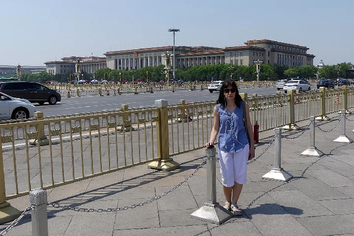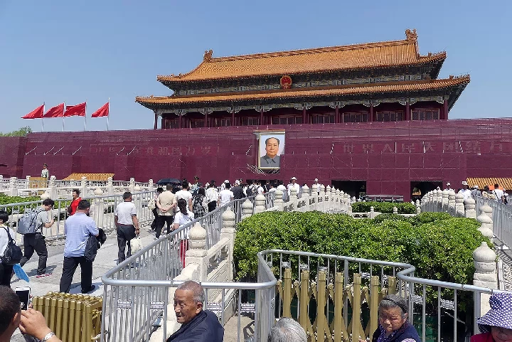 Robimy sobie wspólne, grupowe zdjęcie na tle Bramy Niebiańskiego Spokoju. Niezwykłej bramy. Oprócz tego, że była łącznikiem między światem zewnętrznym a pałacem cesarskim, byłą świadkiem wielu wydarzeń. Brama wraz z placem powstały w 1417 roku, za panowania cesarza Yongle, który jak pamiętamy, przeniósł stolicę do Pekinu. Kilkakrotnie zniszczona w czasie panowania dynastii Ming, obecną postać i nazwę otrzymała po objęciu władzy przez ostatnią dynastię Qing [czing] (w 1644 r.). Z jej szczytu spuszczano na sznurze w dziobie rzeźbionego feniksa cesarskie edykty, ogłaszano wyniki egzaminów państwowych i żegnano ekspedycje wojskowe. Raz do roku z lewej części bramy cesarski urzędnik przeprowadzał rewizję wyroków śmierci, które napływały do Pekinu; w przypadku zatwierdzenia kary - wykonywano ją na miejscu. Sam cesarz pojawiał się na bramie bardzo rzadko; jeśli już to następowało, towarzyszył mu kilkutysięczna świta. Z tarasu na szczycie bramy 1 października 1949 Mao Zedong ogłosił powstanie Chińskiej Republiki Ludowej. Od tego czasu nad głównym wejściem bramy zawieszony jest jego ogromny portret (z przerwą na portret Stalina). Podczas obchodów świąt państwowych zasiadają tam najwyżsi przedstawiciele władz. Pod koniec lat 60. XX wieku brama była w bardzo złym stanie. Na polecenie premiera w latach 1969-1970 zasłonięto ją rusztowaniami i w tajemnicy rozebrano, po czym odbudowano przy użyciu tradycyjnych technik i materiałów.