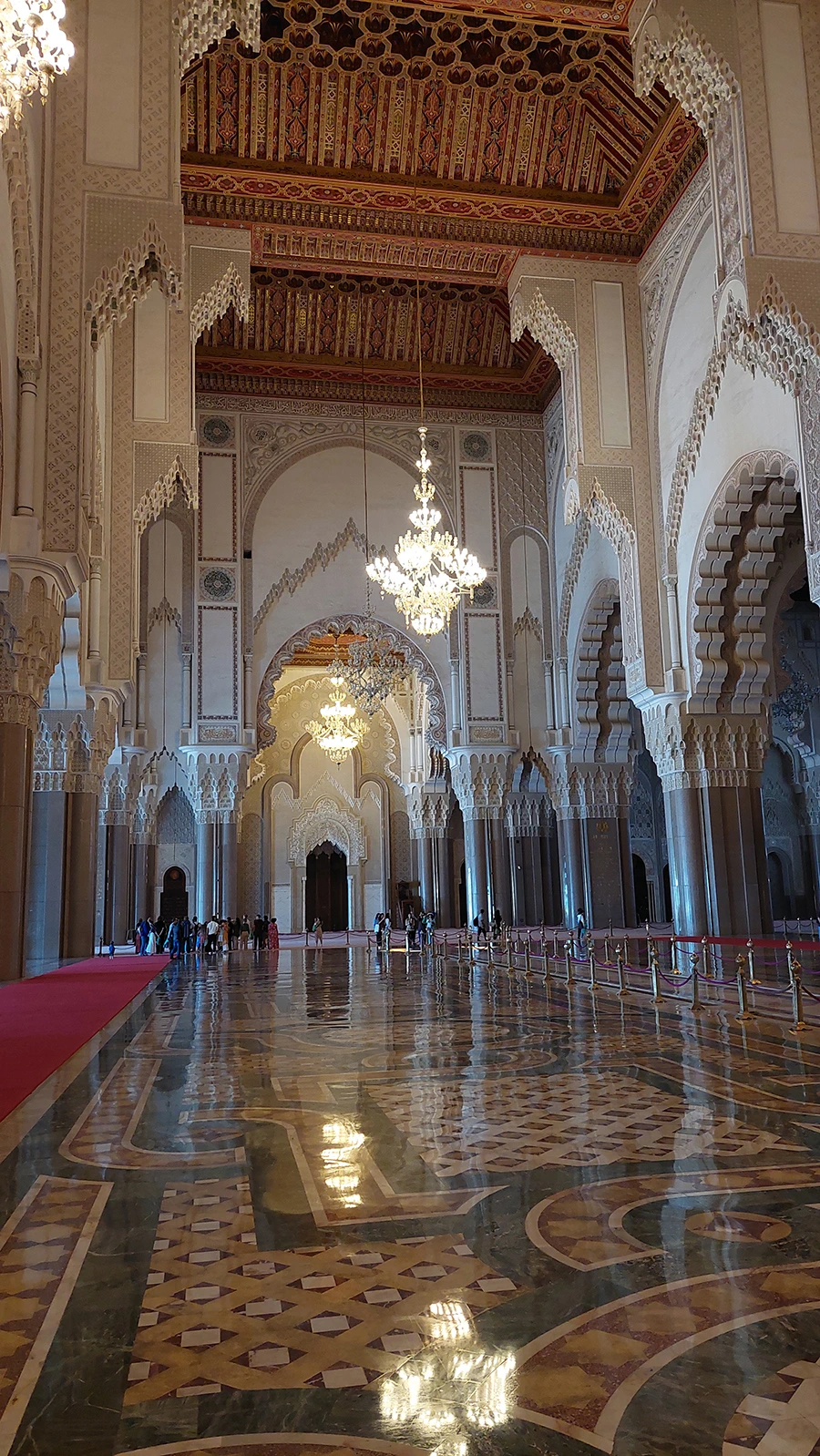 Podchodząc coraz bliżej do ścian meczetu z każdym krokiem widzieliśmy, jak wielką jest budowlą i jak malutki wydaje się człowiek na tle tych wielkich murów czy tytanowych bram. Kiedy weszliśmy do wnętrza, musieliśmy zdjąć buty i po grubych dywanach chodzić wyłącznie w skarpetkach lub boso (tego bym chyba nie polecał, ze względu na miliony stóp, które przeszły przed nami). We wnętrzu było niewielu zwiedzających, dzięki temu mogliśmy dobrze przypatrzyć się wszystkim elementom. Boczna ściana od strony oceanu posiada ażurowe drzwi udekorowane małymi arabeskowymi otworkami, przez które przesącza się światło. Bramy na przeciwnej ścianie są dla odmiany niezwykle solidne - z tytanu. Nawa główna ma 40 m wysokości i przewyższa nawy boczne o 13 m. Na podłodze widzimy „kamienny dywan” ułożony z różnobarwnych kamieni. Według założenia materiały budowlane miały być miejscowe - tak więc kolorowe marmury przywieziono z okolic Agadiru, a granity z Tafraoute. Jednak część marmurów sprowadzono z włoskiej Carrary. Tylko na dużych zbliżeniach zrobionych aparatem widać jak misternie rzeźbiony jest cedrowy sufit głównej nawy. Duża część sklepienia, o rozmiarach porównywalnych do dwóch boisk do koszykówki, jest elektrycznie rozsuwana - aby szybko wywietrzyć wnętrze (może tam przebywać nawet 25 tys. osób), ale też by wierni podczas wyjątkowych nabożeństw mogli dojrzeć rozgwieżdżone niebo. Z sufitu zwisają żyrandole pochodzące z Włoch: 8 największych zawiera szkło z Murano - mają po 6 m średnicy i 10 m wysokości, a ważą po 1200 kg. Po obu stronach głównej nawy, ponad nawami bocznymi, rozciągają się antresole przeznaczone dla kobiet, wykonane z drewna cedrowego. Mogą pomieścić 5000 wyznawczyń Mahometa, a wejście na nie jest oddzielone od wejść dla mężczyzn. Zadziwiająco misterna dekoracja pokrywa każdy centymetr powierzchni. Oglądając ściany na zbliżeniach aparatem widać, że praktycznie nie ma płaszczyzn pozbawionych zdobień. Przez wielką halę modlitewną przechodzimy do mihrabu, a następnie pod jeden z balkonów dla kobiet w nawie bocznej. Zakładamy z powrotem buty i schodami pod minaretem schodzimy do podziemi, gdzie mieści się wielka sala ablucji, w której woda do rytualnych obmywań wypływa ze stylizowanych marmurowych kwiatów lotosu. Ponad nią wznosi się strzelisty minaret, wysoki na 60 pięter. Większość minaretów w Maroku budowano w stosunku długości boku podstawy do wysokości równym 1:5, jednak ten miał „wystrzelić w niebo”, dlatego wybudowano go w stosunku 1:8. Na szczycie umieszczono laser, którego świetlna wiązka wskazuje kierunek do Mekki, a światło sięga do 30 km. Na galerię dla muezzina wiedzie winda i awaryjnie - schody. Plac wokół meczetu od strony oceanu otaczają betonowe mury/falochrony chroniące przed erozją - fale w tym miejscu dochodzą do 10 m. Dociera tu morska bryza, świeży powiew wiatru i cisza przerywana tylko wrzaskiem mew. Wokół meczetu znajduje się szkoła koraniczna, łaźnie, Muzeum Historii Maroka, biblioteka i sale konferencyjne. Gdy opuszczaliśmy meczet, z głośników rozległo się nawoływanie muezzina do popołudniowej modlitwy.