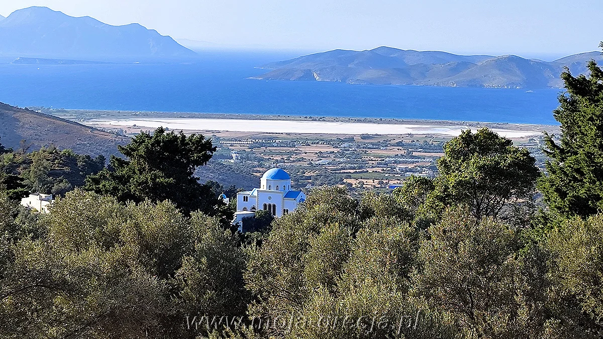 Zia leży zaledwie 6 km w prostej linii od naszego hotelu - po południu wyraźnie ją widać z górnych kondygnacji bungalowów jako oświetlony jasny pasek domów na porośniętych lasami zboczach Dikeos. A jeszcze lepiej ją widać znad jeziora Alikes lub głównej drogi biegnącej do miasta Kos. Samochodem z hotelu do Zia jest około 11 kilometrów, więc droga powinna nam zająć około 20 minut. Zachód słońca na Kos w połowie września jest około 19:20, wyruszamy więc chwilę po 17:00, żeby nie mieć ewentualnych problemów z parkowaniem i zdążyć pochodzić jeszcze po wiosce przed samym zachodem. Wyruszamy znaną nam już dobrze główną drogą w kierunku miasta Kos, by po kilku kilometrach odbić w prawo w dość wąską, ale z dobrym asfaltem drogę biegnącą w kierunku gór. Po kilku kilometrach droga zaczyna wspinać się serpentynami wśród gajów oliwnych i sadów. Na chwilę zatrzymujemy się na poboczu, obok kapliczki na skale, żeby zrobić kilka zdjęć na okolicę. Przy dużym kościele z niebieskim dachem docieramy do skrzyżowania, na którym nasza droga łączy się z inną biegnącą od Main road. To już jedna z wiosek Asfendiou - do Zia pozostało niecałe 1,5 km jeszcze węższą drogą pod górę. Mijamy pierwszą tawernę reklamującą się widokiem na zachód słońca i po chwili docieramy do głównego parkingu przy wjeździe do Zia. Na dwóch nieutwardzonych terasach zaparkowanych jest już kilkadziesiąt aut - z trudem znajdujemy jedno z ostatnich wolnych miejsc (2 godziny przed zachodem słońca!). Ci, którzy przyjadą tu później, będą musieli szukać parkingu za Zia, lub mimo zakazu zaparkują wzdłuż drogi - w samej wiosce nie ma parkingów. Na czym polega wyjątkowość zachodu słońca w Zia? To chyba połączenie dwóch elementów: szerokiej panoramy na całą wyspę Kos, Morze Egejskie i pobliskie wyspy: Kalimnos i Pserimos oraz atmosfery tradycyjnej greckiej wioski z tawernami wyposażonymi w tarasy widokowe i sklepikami z lokalnym rękodziełem. ![]() Kliknij aby zobaczyć powiększenie i dodatkowy opis...