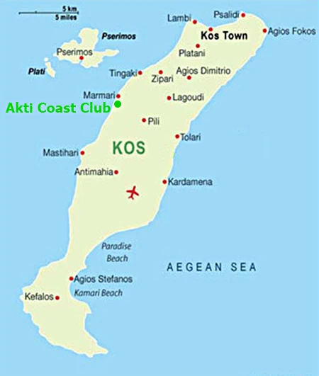 Hotel i okolicaMarmari ![]() Marmari to spokojna, nadmorska miejscowość wypoczynkowa, położona ok. 15 km na zachód od stolicy – miasta Kos i 25 km na wschód od Kefalos - drugiego pod względem wielkości miasta na wyspie. Wbrew temu, co czasem można przeczytać, Marmari nie jest dużym kurortem – to raczej kameralna, rodzinna miejscowość z kilkoma hotelami, tawernami i sklepikami. Większość tawern i sklepików (nazywanych dumnie Supermarketami) leży przy głównej ulicy łączącej plażę z główną drogą (Main Road) biegnącą ze wschodu na zachód wyspy (największy i najtańszy to Supermarket Konstantinos, leżący ok. 750 m od plaży). Natomiast hotele położone są głównie nad morzem, w odległości do 2 km od tej ulicy. Główna atrakcja Marmari to ciągnąca się przez kilka kilometrów, złocista plaża z miękkim piaskiem. To jedna najładniejszych plaż na całej wyspie, z widokiem na zachód słońca nad Morzem Egejskim. Piasku jest tu tak dużo, że miejscami tworzą się wydmy, rzadko porośnięte drobną roślinnością a nawet kwiatami. Przy silnym wietrze piasek z tych wydm nanoszony jest na biegnącą wzdłuż plaży drogę, tworząc urocze „zaspy”. Płytkie i łagodnie opadające dno morskie sprawia, że to bardzo dobre miejsce do kąpieli dla rodzin z dziećmi. Dzięki sprzyjającym wiatrom plaża Marmari jest też popularna wśród miłośników sportów wodnych – szczególnie kitesurfingu i windsurfingu. Płaska powierzchnia tej części wyspy sprawia, że Marmari jest świetną bazą do wycieczek rowerowych (cała Kos jest znana z dobrych tras rowerowych). Około 3-4 km na wschód od Marmari leży nieco większa miejscowość Tigaki, gdzie można znaleźć więcej sklepów, barów i rozrywki. Pomiędzy tymi dwiema miejscowościami znajduje się słone jezioro Alikes – kiedyś miejsce pozyskiwania soli, a obecnie rezerwat przyrody, w którym zimą, a zwłaszcza wiosną można zobaczyć wiele ptaków, w tym flamingi. W połowie lata jezioro prawie całkowicie wysycha, tworząc gładką kilkucentymetrową powierzchnię z czystej soli, lub zmieszanej z drobnym piaskiem. Hotel Akti Coast (PLAN HOTELU) ![]() Kliknij aby zobaczyć powiększenie i dodatkowy opis...