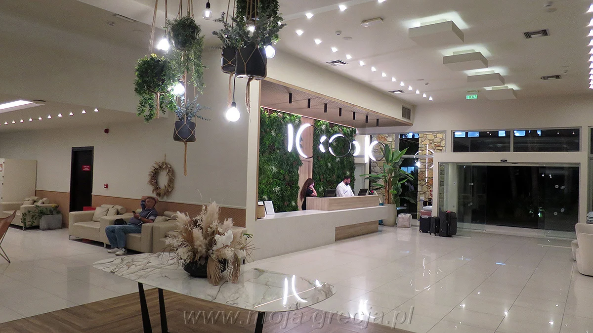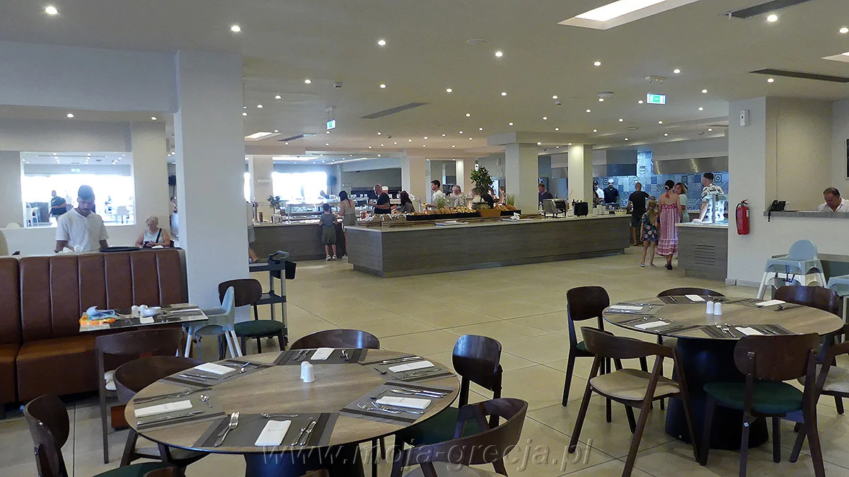 A co z tym jedzeniem „na okrągło”? Pomiędzy śniadaniem i kolacją, czyli od 10:30 do 18:30 dostępne były różnego rodzaju przekąski na ciepło i zimno. Dość monotonne, jeśli miałoby to być podstawowe jedzenie, ale sprawdzało się doskonale np. w przypadku późnego powrotu z wycieczki. Po kolacji, od 23:00 do północy w głównej restauracji serwowano naleśniki na słodko. A od 22:00 do 6:00 w tej samej restauracji bufet z zimnymi i ciepłymi przekąskami - tzw. „późna przekąska”. Czyli przez całą dobę tylko przez pół godziny rano i pół godziny wieczorem nie wydawano żadnych posiłków! Jeśli ktoś ma problemy z samokontrolą w jedzeniu, to zdecydowanie groziło to przejadaniem się. Gdybyśmy mieli wybór, to wybralibyśmy standardowe AI lub tylko trzy posiłki, ale takie „oszczędne” wyżywienie coraz trudniej w Grecji spotkać (alternatywą są tylko hotele z samymi śniadaniami, lub czasem dodatkowo obiadokolacjami - ogólnie bogate AI jest coraz bardziej powszechne). Atmosfera w hotelu ![]() Kliknij aby zobaczyć powiększenie i dodatkowy opis...
