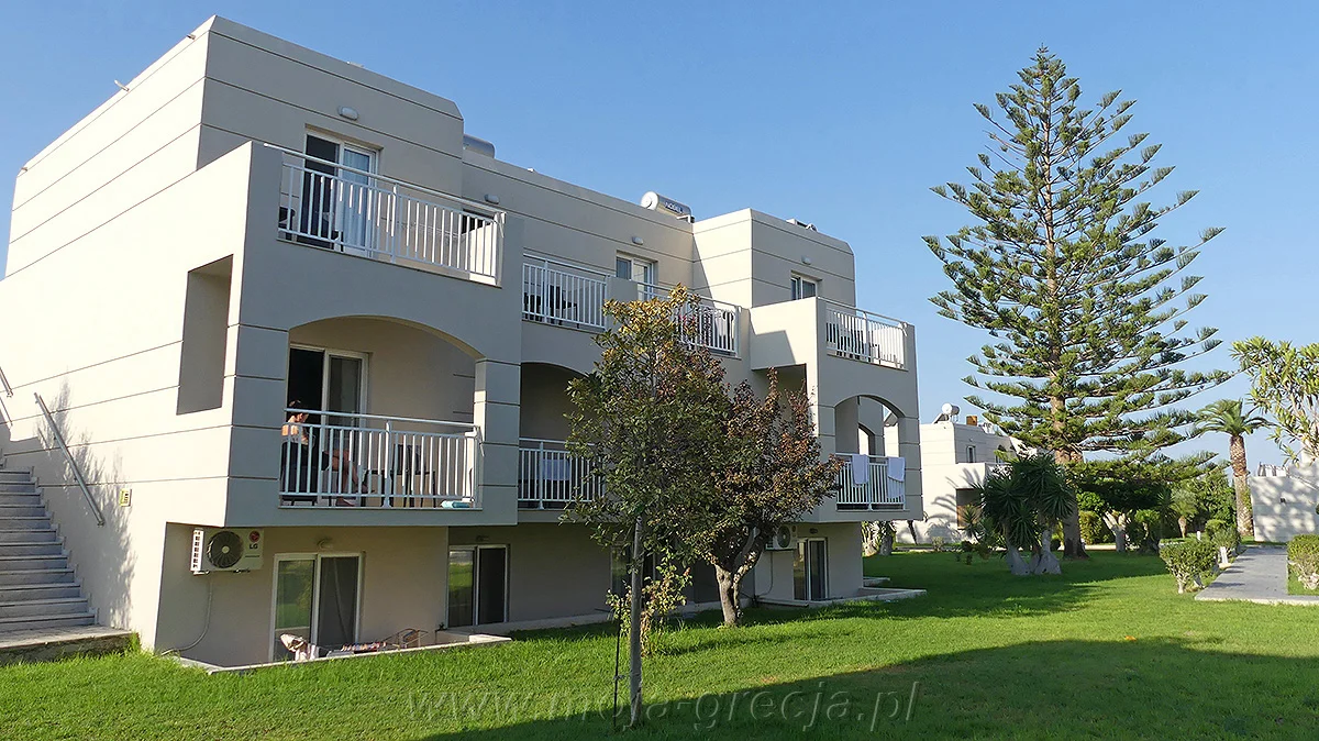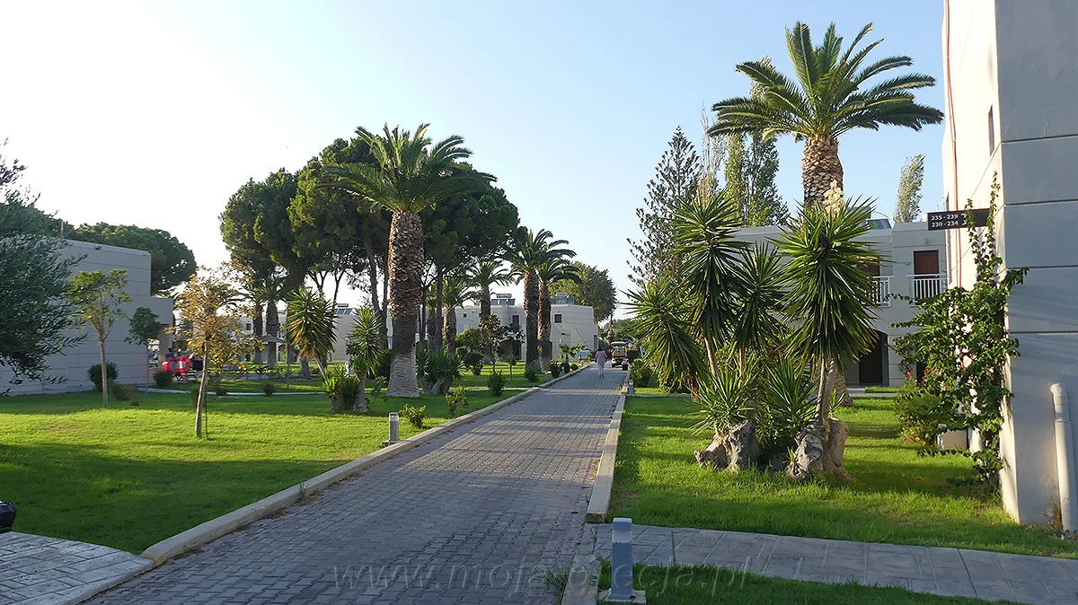Niecały kilometr na zachód od głównej ulicy Marmari, leży hotel Akti Coast Club. Podobnie jak sąsiednie - od plaży oddziela go tylko wąska, lokalna droga z chodnikiem, o niewielkim ruchu (wieczorem oświetlona). Cały kompleks położony jest na rozległym, płaskim obszarze, o powierzchni ponad 6 ha. 341 pokoi rozmieszczonych jest w ponad 20 budynkach o wysokości jednego lub dwóch pięter. Wszystkie budynki otoczone są licznymi drzewami (głównie palmy - od małych po bardzo wysokie) i krzewami (głównie bananowce - kwitnące i z owocujące, hibiskusy z kwiatami o różnych kolorach i jukki) oraz zadbanymi trawnikami. Dostępne w Internecie zdjęcia satelitarne są dość stare i nie pokazują stanu faktycznego - obecnie tych roślin jest naprawdę bardzo dużo i bez żadnej przesady można stwierdzić, że budynki hotelowe znajdują się w ogrodzie. W ogrodzie nie brakowało też zwierząt - pod względem ilości dominowały niewielkie ptaki podobne do wróbli - przesiadywały stadami w koronach drzew dając wieczorami niezłe koncerty. Ale najbardziej widoczne były oczywiście koty - było ich ponad 10, ale trudno to było policzyć (niektóre zakradały się do restauracji, próbując nawet ściągnąć coś z talerzy). Bywały też zwierzęta egzotyczne - jaszczurki i cykady. Budynek recepcyjny znajduje się w południowej części kompleksu, dość daleko od morza (ok. 400 metrów). Jest przy nim spory parking, gdzie bez problemów można zaparkować wypożyczone auto czy quada. Ponieważ od naszego pokoju było blisko do rececji, często spędzaliśmy tam wieczory grając w scrabble czy kości. A ponieważ był tam też duży bar, nie trzeba było daleko chodzić po napoje. Na przeciwnym krańcu ogrodu, blisko morza, (ok. 100 m) znajduje się znacznie większy budynek, w którym zlokalizowane są trzy restauracje, bar, sklepik i niewielka część pokoi - tych z widokiem na morze. Z tej strony, przy wyjściu z hotelu od strony morza też jest parking, ale znacznie mniejszy. Dojście stąd do plaży wymaga przejścia przez ulicę i zadrzewione pasmo wydm. Przy bramie znajduje się pomieszczenie ochrony - wartownik nie tylko śledzi stąd obrazy z dziesiątków kamer, ale też w razie czego powstrzyma dzieci, które próbowałyby samodzielnie przejść z hotelu nad morze. ![]() Kliknij aby zobaczyć powiększenie i dodatkowy opis...